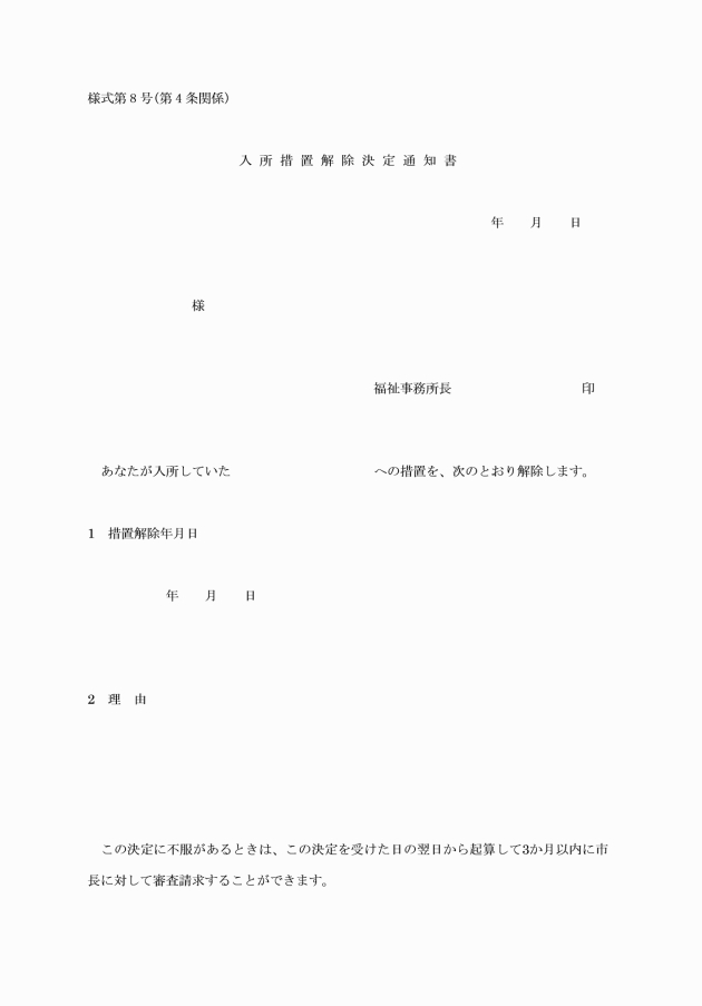 第4条 福祉事務所長は、法第18条第2項の規定により障害者支援施設等(以下「障害者支援施設等」という。)に入所委託する措置(以下「措置」という。)を行うときは、あらかじめ当該障害者支援施設等の長に対し、入所依頼・委託決定通知書(様式第5号)を送付しなければならない。